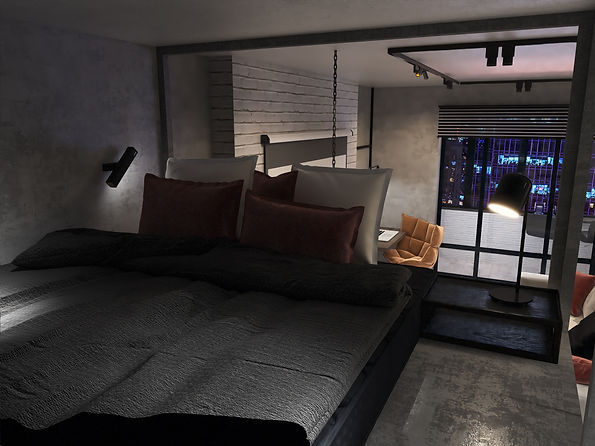 The balcony — a cozy spot with bar stools and gentle lighting, where one can enjoy sweeping views of the city, soak in the atmosphere of the metropolis, or simply indulge in a morning coffee ritual.
